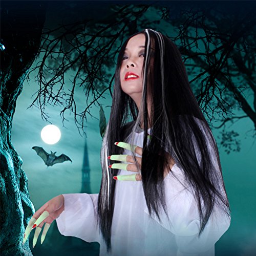 Package Including1 * Women Girls Long Straight Black Synthetic Fiber wig with white highlight Wig Ghost Wig For Halloween Cosplay Costume