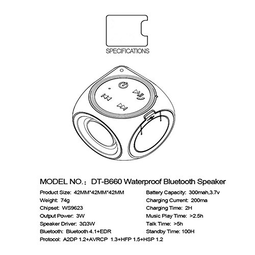 Feature : Mini wireless speakers, portable and lightweight, pefect for outdoor living, easy to hang on your bag with the hook / Equiped with latest Bluetooth Version 4.1, perfect crystal and natural stereo sound with super audio performance / Compatible with ios android smartphone and PC which have Built-in Bluetooth. Bluetooth 4.0 EDR (enhanced data rate) allow up to 33ft. Built-in Microphone for hands-free calls, online chatting including Skype, Face Time, etc. / Waterproof Design IPX7 : Effectively protect from water and dust, covered with silica gel cases, offer a comfortable touching feeling / If you have any question with the item, please email to: support@elegiants.com, we will reply within 24 hours. We offer an 180-day money-back guarantee, if the purchase has any quality defect. Please be assured the purchase