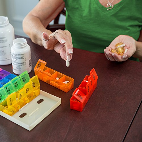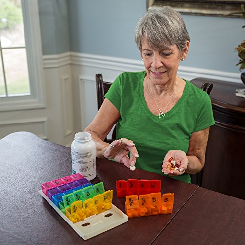 PEACE OF MIND FOR CAREGIVERS: Convenient XXL pill organizer is perfect for arranging medication 7 days in advance! Oversized Time-of-day compartments make pill management simple & precise. Also comes with braille symbols on the white tray to signify the day of the week.