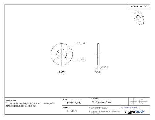 316 Stainless Steel Flat Washer, 4" Hole Size, 0.203" ID, 0.438" OD, 0.032" Nominal Thickness, Made in US (Pack of 100)