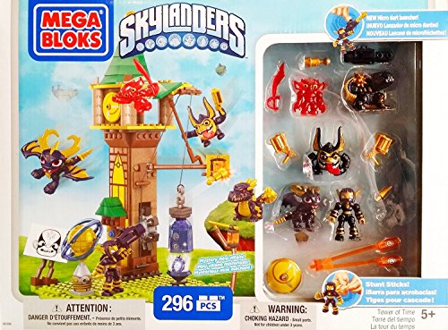 -. Feature : RETIRED Mega Bloks Skylanders Tower of Time Building Set with Legendary Figures (95356). / Buildable 296 piece Tower of Time with villain trap & Kaos enemy target. / Includes: Micro mini darts that really shoot, stunt sticks & mini figure weapons & accessories. / Includes: 4x Legendary Skylanders figures (Stealth Elf, Trigger Happy, Spyro & Bash), 1x Red Greeble & 1x Special Mystery Villain figure. / Recommended for ages 5+
