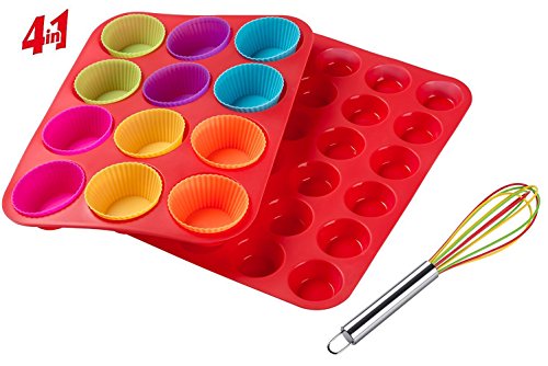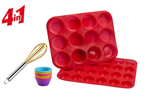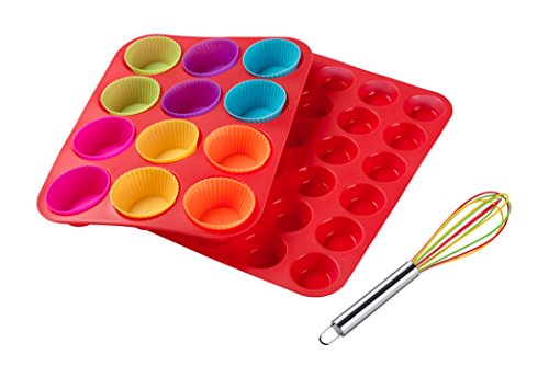 Mini Muffin Pan 12 & 24 Large Cup Sizes Silicone Baking Bakeware Set:With Cupscake Liners+ Whisk BPA Free Non Stick Dishwasher Safe Red Trays
