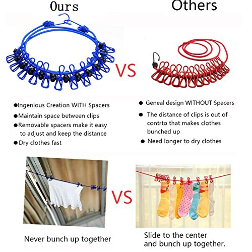 - Anti-slip Design with Positioning Bead - The 12 Clips are separated by 13 Black Rubber Beads (which can slide along the cords) that prevents items from bunching together due to weight or wind and improves drying effect. So, No need to worry that your laundry will drop off in windy days.