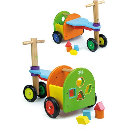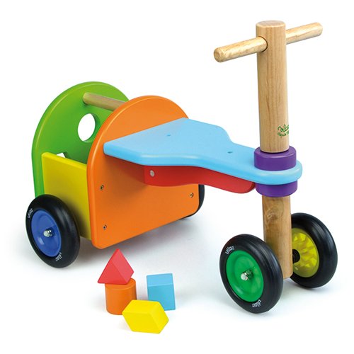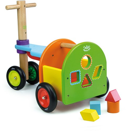 Vilac's rainbow tricycle is built for play. This ride on toy has a block sorting basket attached that has room for other toys to ride along. Comes with blocks to sort and is easy to assemble. It is brightly colored, made of hard wood and a painted non toxic finish. The rainbow tricycle will offer hours of fun scooting about inside or out. Deep in the heart of the jura surrounded by mountains, lakes and forests, French toy company Vilac has been making wooden toys in classic, old world style with contemporary colors and designs since 1911. Vilac toys are unique, never go out of fashion and have lasting appeal for all generations. Vilac nourishes children's imaginative play with animated, joyful characters and reinterpretations of classic toys that will stand up to wear and tear.