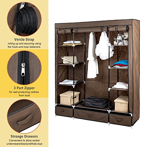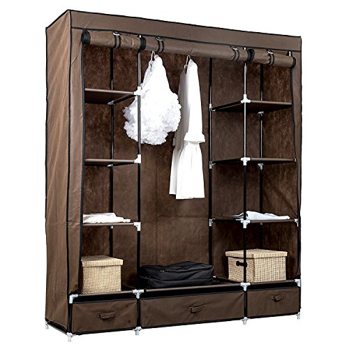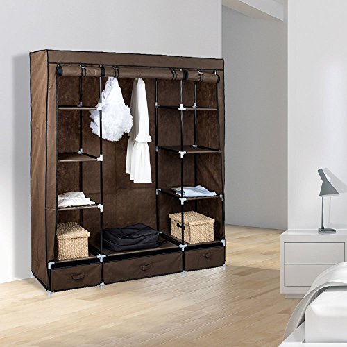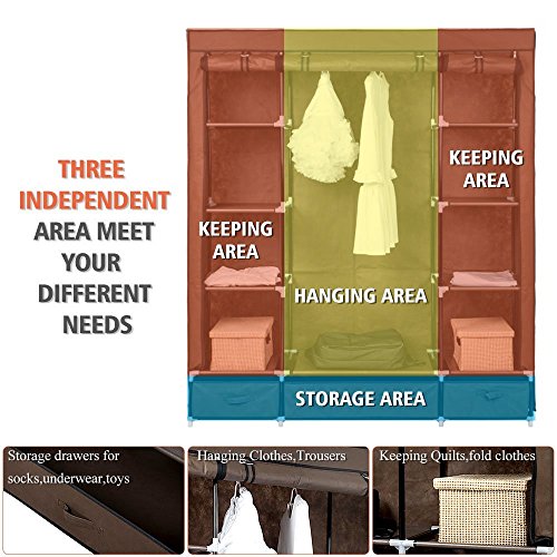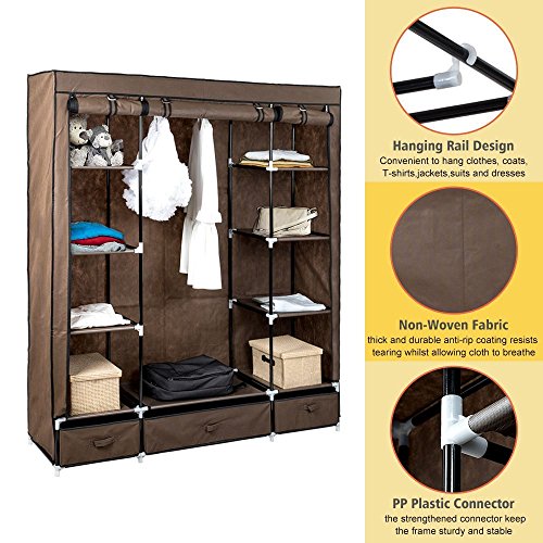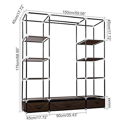 TopHomer Canvas Wardrobe Clothes Cupboard Storage Shelf Shelves Organizer with Hanging Rails Rack and 3 Drawers Brown
