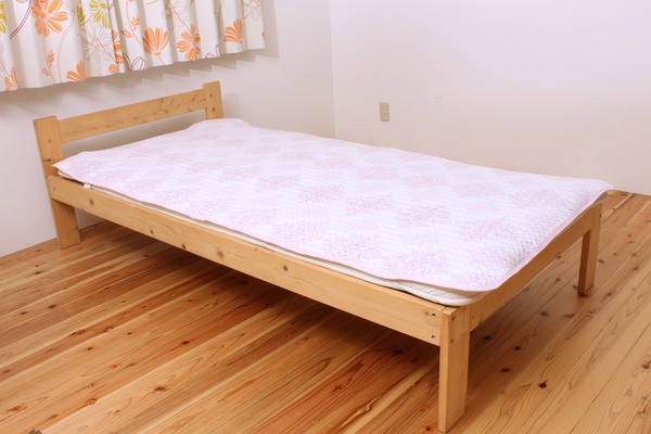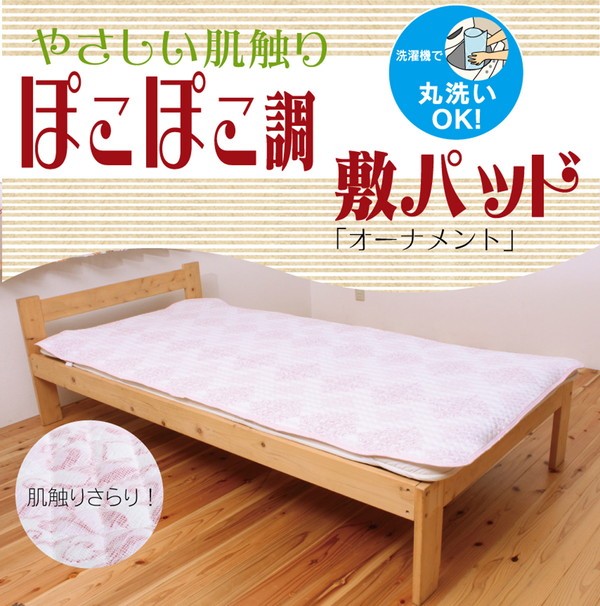 やさしい肌触りのポコポコ調敷きパッドです。表地の生地表面には通気性に富み、吸湿性にも優れたガーゼを使用しています。ご家庭の洗濯機で洗えるので、清潔にご使用頂けます。四隅にゴムバンド付きです。