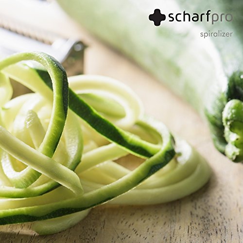 ScharfPro™ Folding Vegetable Spiralizer - Three Blades Make professional looking garnishes in mere seconds; create zucchini noodles, curly fries, cucumber ribbon strands, onion rings, apple strands and much more in a matter of seconds. Get your family to eat more vegetables and fruits with these exciting designs. Use with a variety of firm vegetables and fruits including zucchini, cucumbers, potatoes, carrots, apples and much more.