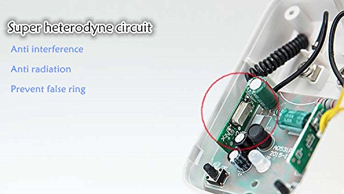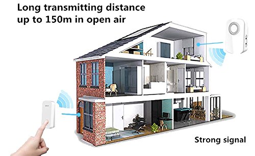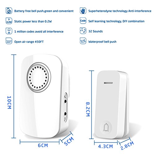 -. Feature : Self-powered doorbell, no batteries required for main receiver & transmitter. Easily plug (US Standard) receiver into an electrical outlet. CE, FCC, RoHS certified. / 32 different ring tones, 4 levels of adjustable volume from 30db to 85db. / Stable quality with strong signal. IP44 weatherproof for bell push button, acceptable for outdoor use. Operating range of 150m in open area. Each doorbell is set with unique radio frequency code at the factory, your doorbell will not interfere with other users. / Screws and double-sided adhesive tapes included for easy installation of the transmitter. / Elegant, simple and stylish design. ABS material, eco, safe and impact resistance.Durable & Reliable: The lifespan of transmitter is up to 20 years, pressing 30 times per day.