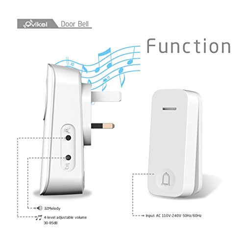 -. Title : Ovikel Wireless Doorbell No Battery Required for both Transmitter and Receiver, Long working range 500feet(150m), IP44 Waterproof Push Button, 4-Level Volume, 32 Ring Tunes (White),OV3-010R