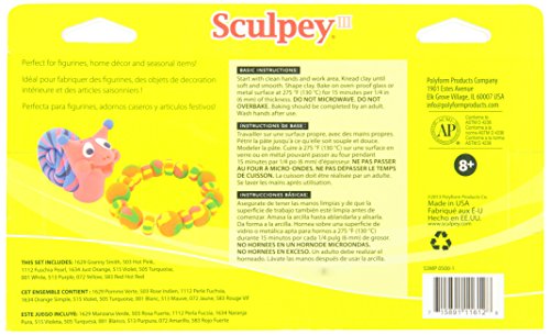 -. Brand : Sculpey -. Color : Main -. Feature : Dimensions: 5.45 in. h x 9.28 in. w x 0.88 in. d / Weight: 1.45 ounces / Made in US -. Label : Polyform Products Company -. Manufacturer : Polyform Products Company -. PackageQuantity : 1 -. ProductGroup : Art and Craft Supply -. ProductTypeName : ART_AND_CRAFT_SUPPLY -. Publisher : Polyform Products Company -. Size : Main -. Studio : Polyform Products Company -. Title : Sculpey III Polymer Clay Multipack 2oz 10/Pkg Assorted Colors and Sizes