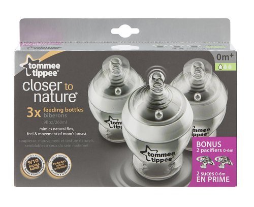 Tommee tippee Closer to Nature Bottles are intuitively designed for a close, comfortable and relaxed feeding experience. An extra-wide, soft silicone nipple mimics the feel, flex and movement of breastfeeding for easy latch-on and a natural drinking action. A super-sensitive valve helps prevent the gas and discomfort that can come if baby ingests air. Switching between breast and bottle is made easier than ever before! Contains 3 9oz bottles with Slow Flow nipples and hygiene caps and 2 BONUS 0-3M Pacifiers. All BPA and Phthalate free.