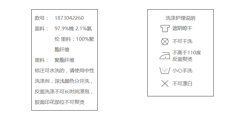 97.9%棉 2.1%氨纶 里料:100%聚酯纤维