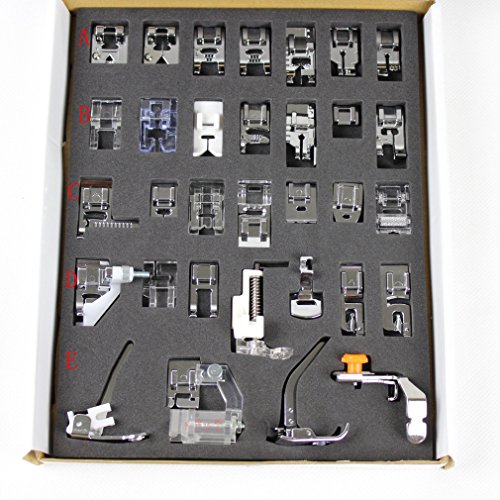 - Feature : These feet are universal fit. Will fit most Brother, Elina, Singer, Janome / New Home, Pacesetter, Elnita, Juki, Kenmore, Pfaff, Viking, and domestic machine with a low shank system. However, Not for these industrial, old, MINI sewing machines. / 1. Darnign Foot, Low Shank; 2. Adjustable Bias Binder Foot; 3. Knit Foot; 4. Zipper Foot, Low Shank / 1. Blind Stitch Foot; 2. Applique Foot; 3. Open Toe Foot; 4. Darning Foot, Low Shank; 5. Gathering / Welting Foot; 6. Hemmer Foot; 7. Round Hemmer Foot / 1. Open Toe Embroidery Foot; 2. Round Bead Foot; 3. Zig Zag Foot; 4. Cording Foot; 5. 1/4" Quilting Foot; 6. Pintuck Foot 9 Grooves; / 1. Braiding Foot; 2. Fringe Foot; 3. 5 Hole Cording Foot; 4. 7 Hole Cording Foot; 5. Edge Joining Foot; 6.1/4" Quilting Foot; 7.Straight Stitch Foot