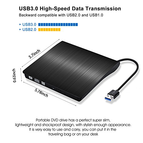 ◆ USB3.0 HIGH SPEED INTERFACE: Our CD drive and the USB cable are combined in one.Embedded USB cable design, easy for storage.Ultrl Slim portable size is equipped with USB 3.0 high speed interface, bringing you faster data transfer speed and stable performance, compatible with USB 2.0 and USB 1.0. It has a slim,lightweight,shockproof design and stylish appearance.