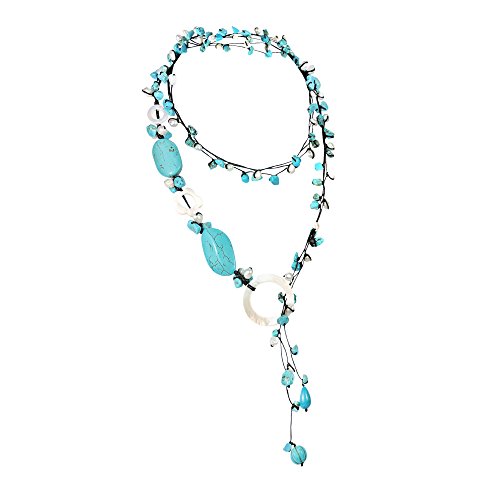 Handcrafted of genuine cultured freshwater white pearls, mother of pearl and simulated turquoise, this necklace makes a bold fashion statement. PLEASE NOTE: The handcrafted nature of this product will produce minor differences in design, sizing and weight. Variations will occur from piece to piece, measurements may vary slightly.Includes an original AERAVIDA organza jewelry pouch (comes in various colors), also handmade by our Artisans. Perfect for gift giving to someone special or keep for yourself!