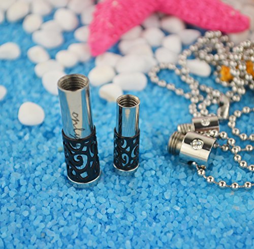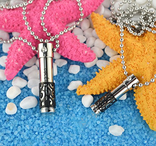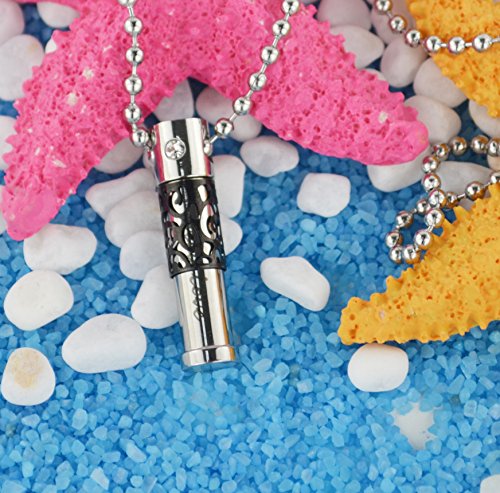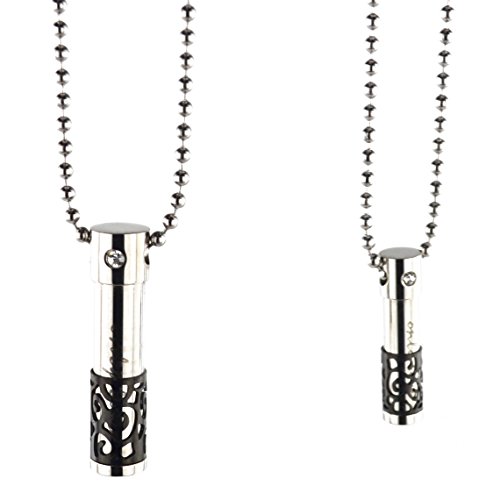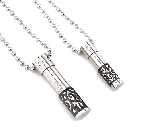 This His and Her essential oils Pendant Necklace Set is the perfect solution for releasing a LIGHT aroma from essential oils and/or perfume. Works perfect to keep a few drops of your favorite essential oil with you at all times. Simply unscrew cap and pour out essential oils! How The Essential Oil Diffuser Necklaces Work:Simply unscrew the top cap from the stainless steel vial and gently add a few drops of essential oils in the bottle.If you are going to be laying down, it's recommended to use just 1 drop. The aroma from the essential oils or perfume will release through the holes in the cap. How To Clean Diffuser Necklaces:Get a Q-tip and remove some of the cotton on the end until it will fit inside stainless steel bottle and swab out. Color: Black. Pendant for man:1.5"L *0.35"W Pendant for woman:1.14"L *0.28"W Length of the chain: About 22.8 Inches Package:2 Pcs Note:For best result Using only high quality, pure essential oils.