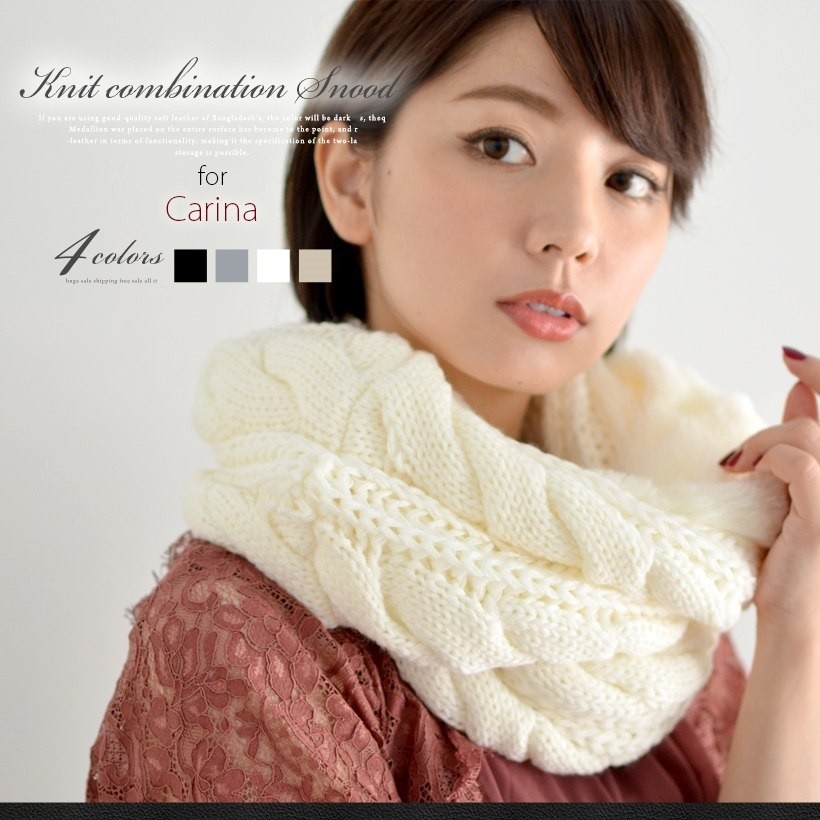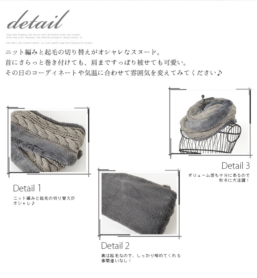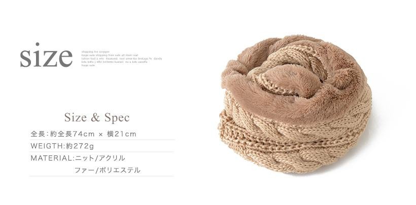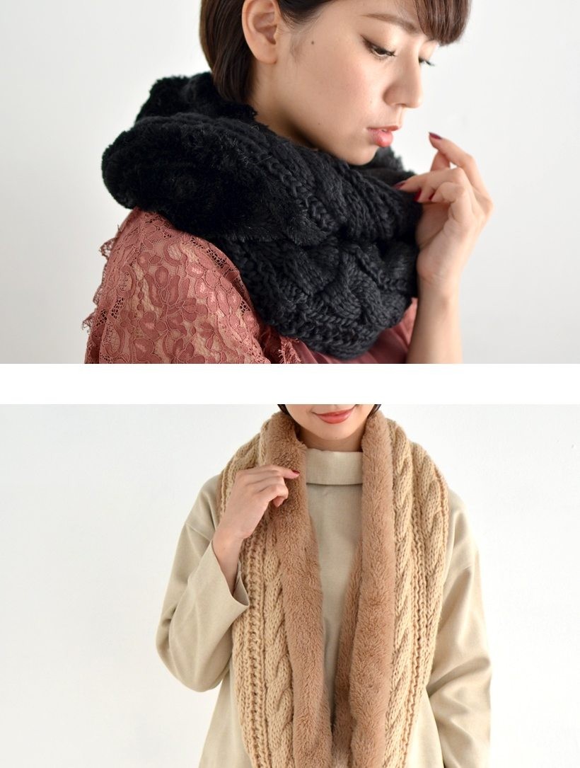 毛足の短いフェイクファーと編み込んだニットのコンビスヌード。二重に巻くと自然とファーと編み込み部分がツイストされ、巻き方ひとつで全然違う雰囲気になるので、ひとつあれば色んなシーンで活躍します。肩掛けやボレロとしても使え多機能です!●全長:約全長74cm × 横21cm●重さ:約272g●素材:ニット/アクリル ファー/ポリエステル[カラー]ブラック・グレー・アイボリー・ベージュ