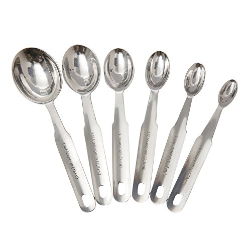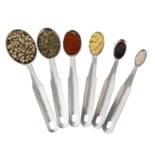 Measuring Spoons 6 Piece Set - Superior New Design - Oval Spoons Fit Easily into Spice Jars - 18:8 Stainless Steel Heavy Duty for Professional or Home Use - Engraved Long Handles Easy to Read