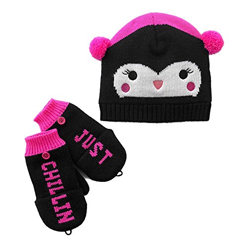 Studio : Jumping Beans Publisher : Jumping Beans Binding : Apparel Product Description She'll stay warm and cute in this ultra-charming girls knit beanie and convertible gloves set. The fleece-lined knit beanie is black with pink pompom ears and an adorable penguine character, and the convertible gloves are black with a flip-top design and a button to hold the mitten when not in use. The left hand says "Just" and the right hand says "Chillin". 100% Acrylic with 100% Polyester fleece lining. Size S fits most girls size 4-6, M fits size 8-10, L fits size 12-14. 0