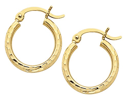 Versatile and timeless, hoop earrings are the perfect way to add a sophisticated glimmer to every day. These 1/2 inch earrings are crafted from shining 14 karat yellow gold and come alive with a glimmering diamond cut, making them an affordable way to reinvigorate your jewelry collection.