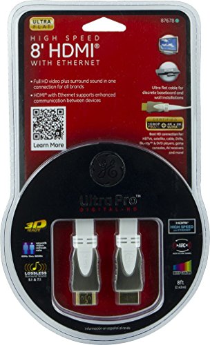 GE 8 ft. UltraPro High Speed HDMI Cable with Ethernet, White, 1080P Full HD, 4K Ultra HD, 3D Ready, Flat Cable, 87678