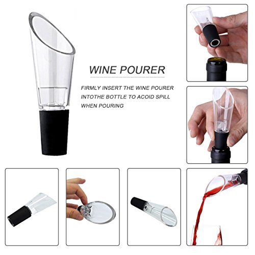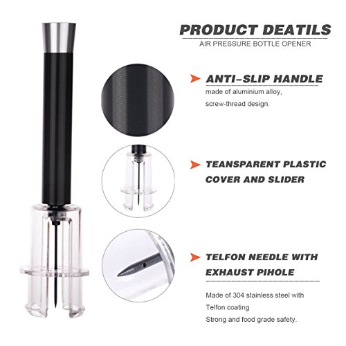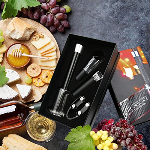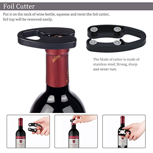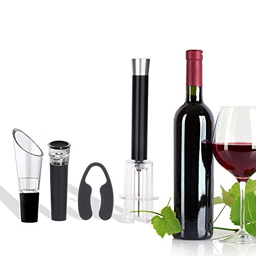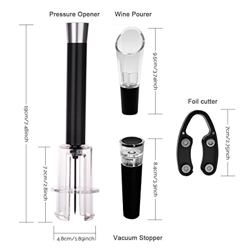 -. Feature : 【AIR PRESSURE PUMP OPENER】It's easy to handle and open the bottle of red wine quickly, compact size design , you could take it when camping / 【MAGNETIC DESIGN FOIL CUTTER】Built-in magnet ,put it on the neck of wine bottle , squeeze and twist the foil cutter , the foil will be removed easily / 【WINE AERATOR POURER】The intake design help to draw air into the red wind , then the taste of red wine will be better / 【VACUUM STOPPER】It's convenient to seal the wine, Air-tight seal keep wine fresh. / 【GREAT GIFT】It's the ideal the choice for any occasion, home use , festival party , wedding and so on , it's also the great gift for wine lovers and friends