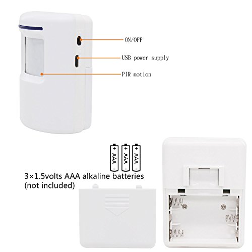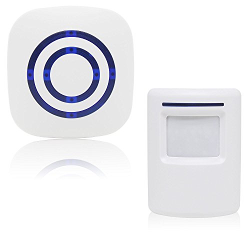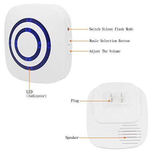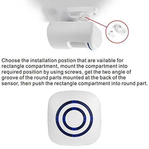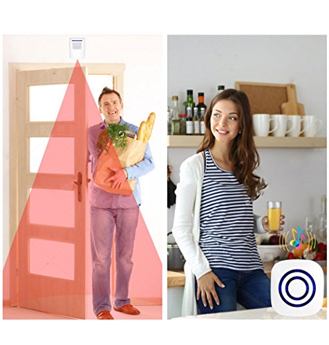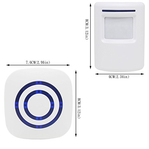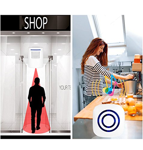 -. Feature : Wireless plug-in receiver is convenient to plug into any standard outlet. And our wireless infrared sensor is wall mountable so it is easy to install it on your front door, window frame and etc. / 3 switches on receiver: The sound switch is for choosing sound or silence modes. The music switch is for choosing 38 different ringtones. The volume one is for adjusting the volume: high, middle and low. / Plug in the receiver and place 3 AAA batteries (Not Included) to the sensor. Turn on switch and it is ready to use. Infrared sensing distance is up to 9.8-22.9 feet (3-7 meters). Please wait for 30 seconds for activation. / Working Range up to 230 feet (70 meters) between receiver and sensor. Allows you to place the sensor far away from the receiver. Please keep the sensor in a clear path to the receiver, so that you can get optimal performance. / Ideal for doors, driveways, walking paths at your house. Also great to alert business owners to know when customers enter stores.