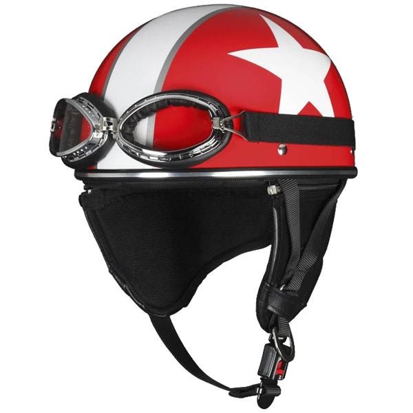 | 125cc以下のオートバイ用ハーフ型ヘルメットです。昔の映画に出てくるようなヴィンテージ風のデザインがオシャレ☆ゴーグル&イヤーカバー付きで、走行中の風から目と耳をガードしてくれます。あごひもにはワンタッチホルダーを採用!! |