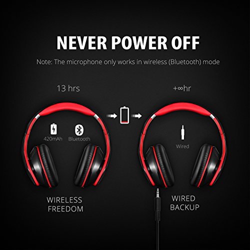 In the wireless mode: With a built-in 420mAh battery which provides 13 hours' continuous wireless playback and let you get rid of the tangled cables on the move;