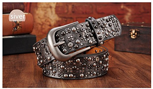 -. Title : YAMEZI Women's Silver Gray Retro PU And Cowhide Mixed Crystal Studded Rivets Belt