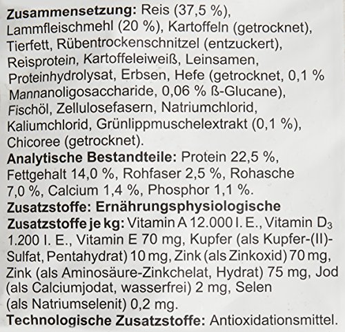 原材料:【原材料】米(37.5 %)・ラム肉粉(20 %)・ジャガイモ(ドライ)・動物性脂肪・ビートパルプ(糖分除去)・ライスプロテイン・ジャガイモタンパク質・亜麻仁・加水分解タンパク質・エンドウ豆・酵母(ドライ、マンナンオリゴ糖0.1 %、 ßグルカン0.06 %)・魚油・セルロース繊維・岩塩・塩化カリウム・グリーンリップドマッセルエキス(0.1 %)・チコリ(ドライ)
