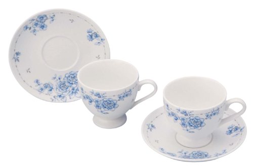 일본 그릇 산고우 도기 산호― 블루 플라워 페어 찻잔 및 받침 세트 6735-02