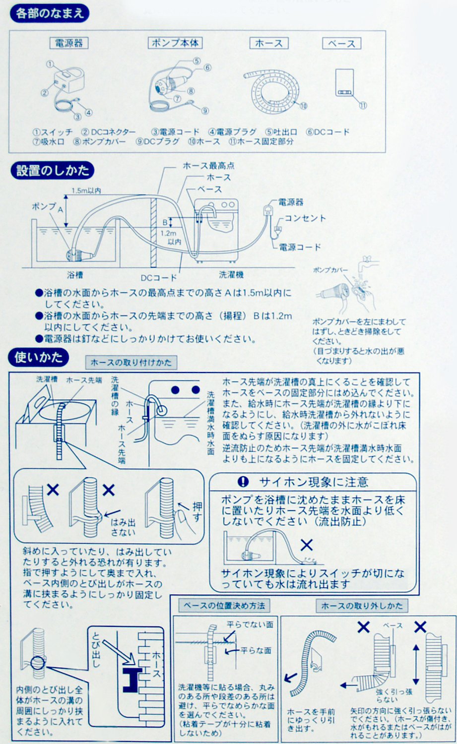 サイズ:ホースの長さ・3m/コードの長さ・1m 本体重量:820g 材質:本体・ポリプロピレン/ホース・EVA 原産国:中国 色:ポンプ・ホワイト、ブルー/電源器・ホワイト/ホース・ホワイト