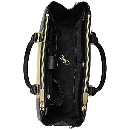 -. Binding : Apparel -. Brand : -. ClothingSize : Large -. Color : Black/Apple Green -. Department : womens -. EAN : 0888235586120 -. Feature : Bi-color Saffiano leather / Double handles with 4-1/2" drop; adjustable shoulder strap with 22" drop / Magnetic closure / Interior features two zipper compartments, 1 zip pocket, 3 slip pockets, 1 cell phone pocket and key fob / 14" W x 10" H x 5" D -. Label : -. Manufacturer : -. MPN : 30T4GJTS7T -. PackageQuantity : 1 -. PartNumber : 30T4GJTS7T -. ProductGroup : Shoes -. ProductTypeName : ACCESSORY -. Publisher : -. Size : Large -. Studio : -. Title : MICHAEL Large Sutton Center Stripe Satchel in Black & Apple -. UPC : 888235586120