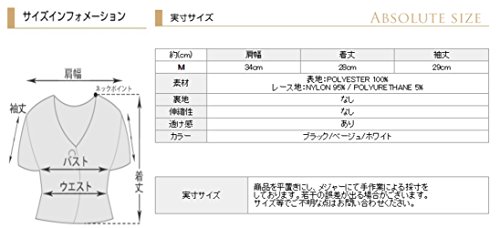 -. Feature : 【カラー】ベージュ,ブラック,ホワイト(透け感あり) 【素材】表地:ポリエステル 100% レース地:ナイロン 95% ポリウレタン 5% 【裏地】無し / 【サイズ】M 【伸縮性】無し 【ファスナー】無し 【付属品】無し / 【商品特徴】フロントスタイルはシンプルですが、バックスタイルはレースとリボンの組み合わせで、女性らしさがぎゅっと詰まったボレロです。