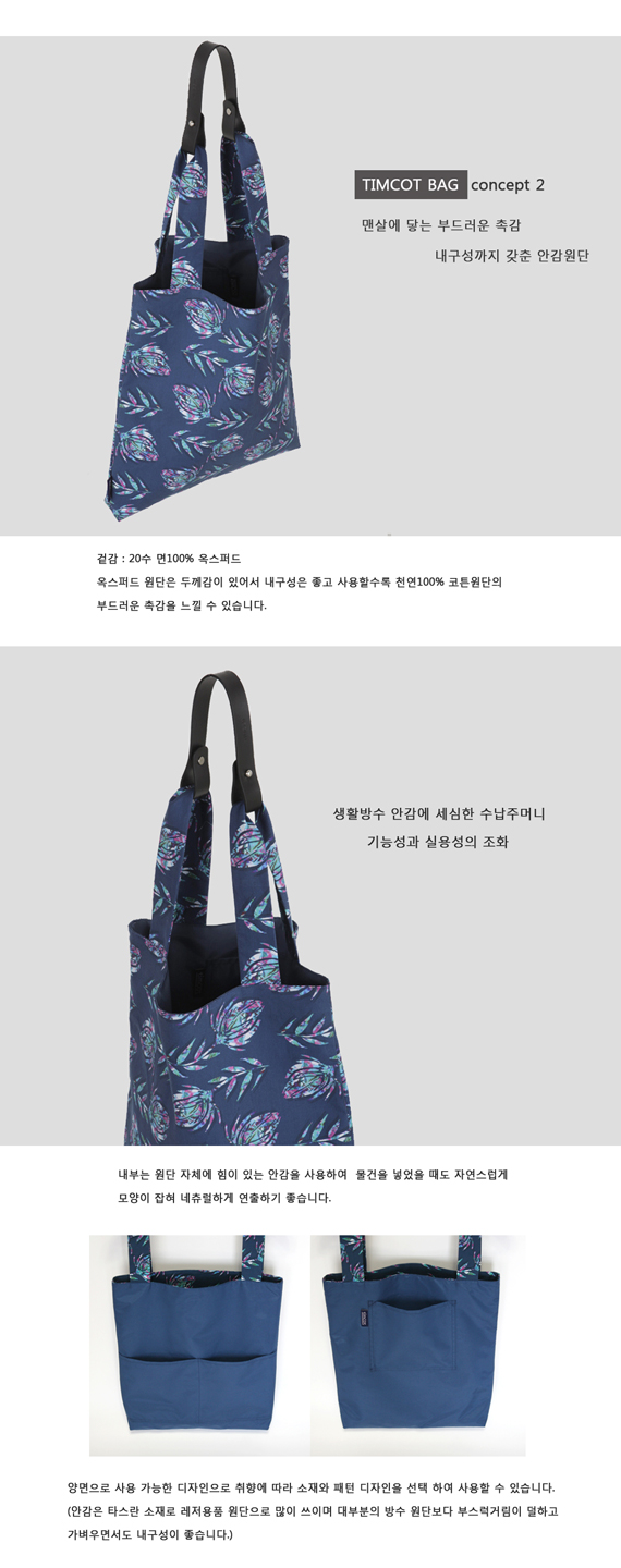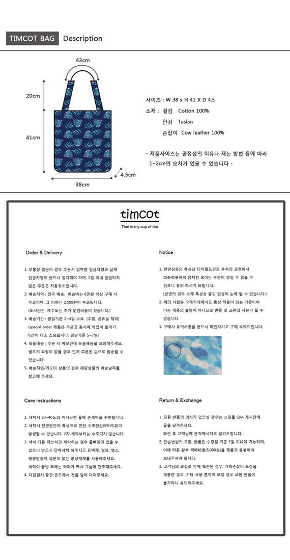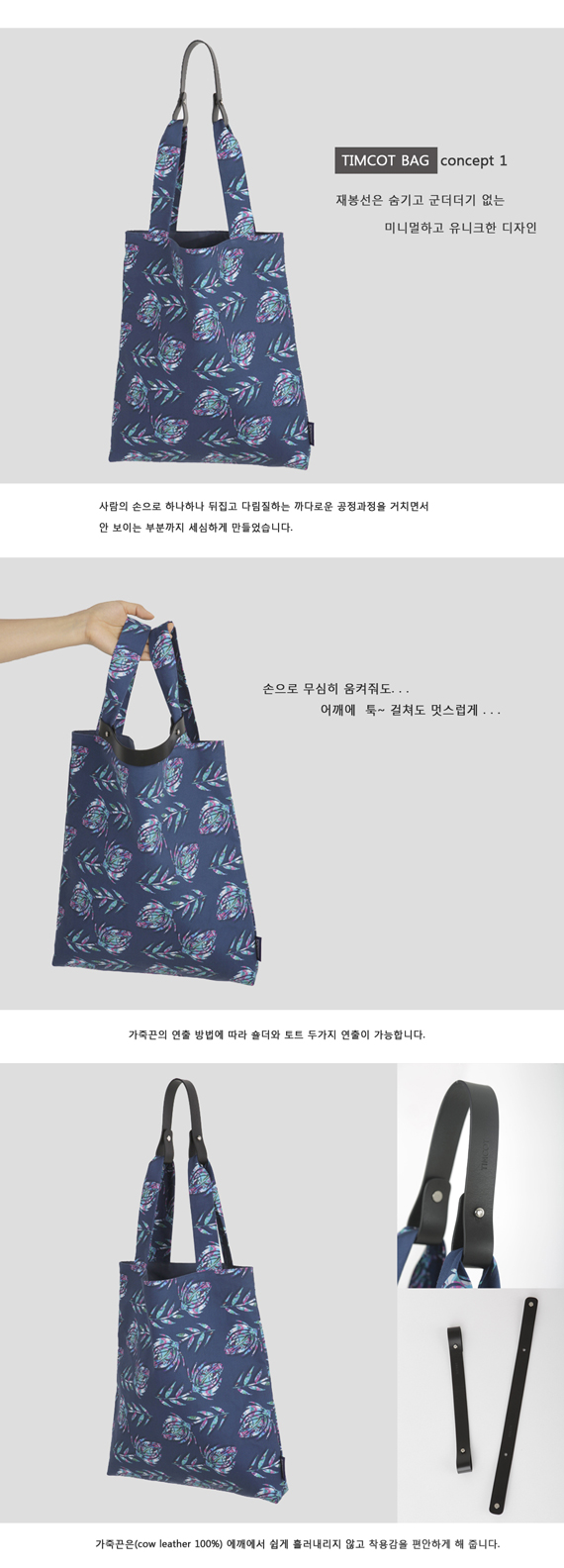 겉감-20수 옥스퍼드(면100%), 안감-생활방수 타스란, 천연가죽손잡이 가죽손잡이는 가방과 분리된 상태에서 발송하니 제품을 받으시면 상세내용 그림을 참조해서 사용해주세요. 통가죽의 특성상 처음 끼울 때는 다소 빡빡할 수 있습니다. 세탁할 때는 분리해주세요.