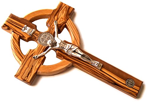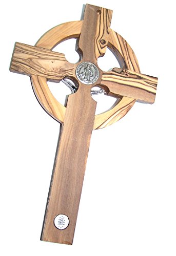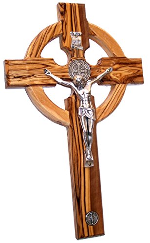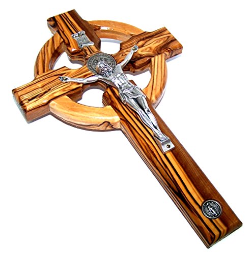 Celtic And Saint Benedict and Miraculous Medal Holy Land Handmade Wall Wood Cross Crucifix Silver tone - 10 Inches