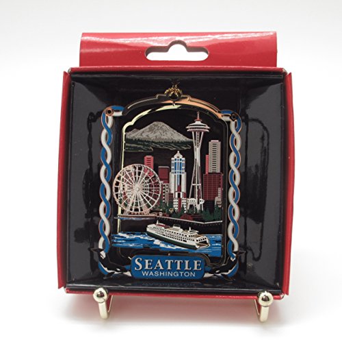 -. Feature : Seattle Washington City Skyline Christmas Ornament / Space Needle Mountains Ferry Cruise Ship Whales / Seattle Souvenir Gift / Genuine Color Brass Ornament measures 2.25 x 3 inches / Box may vary depending on availability