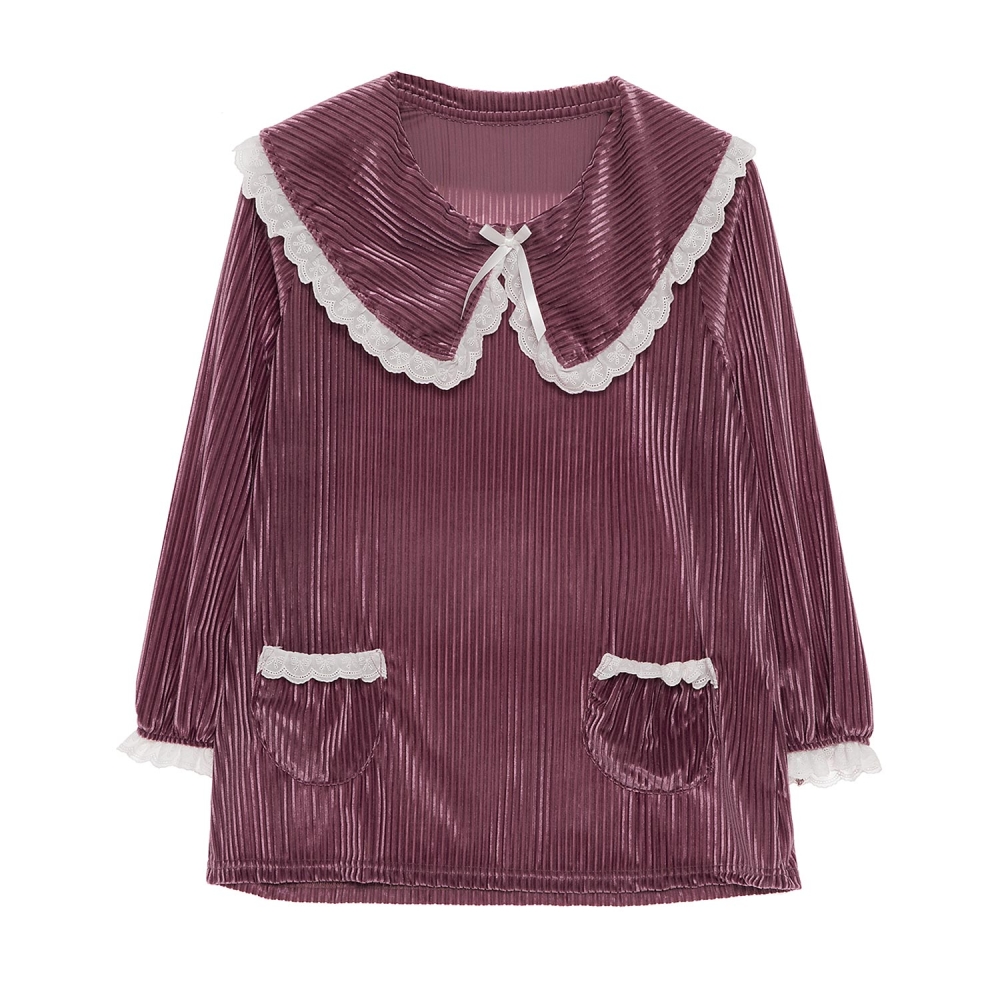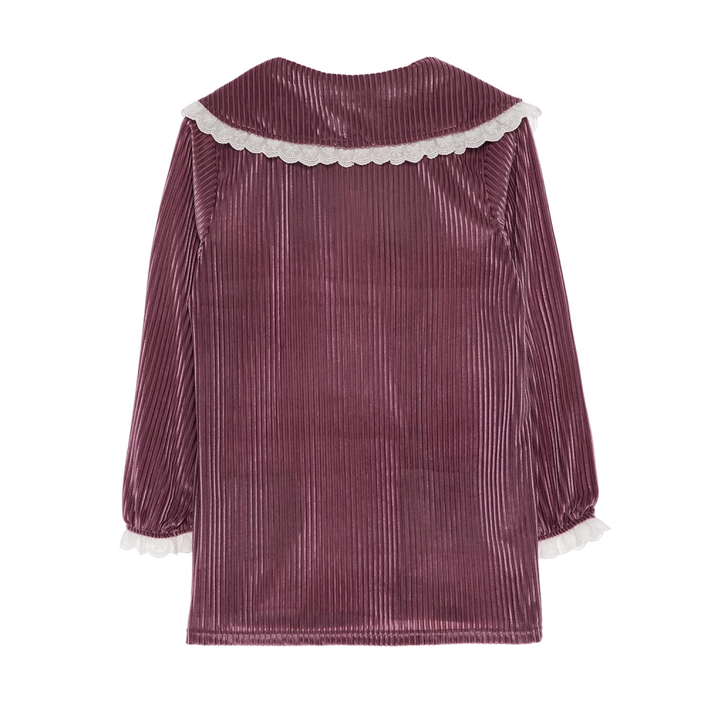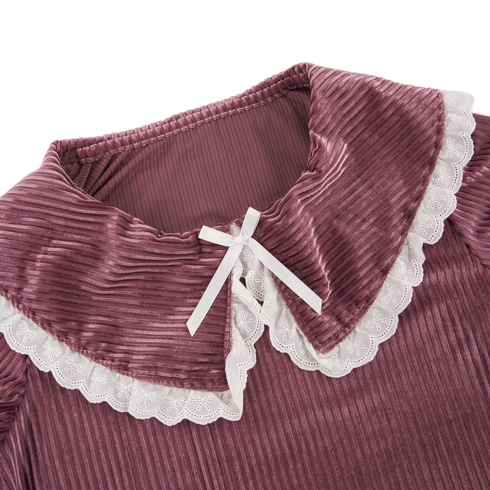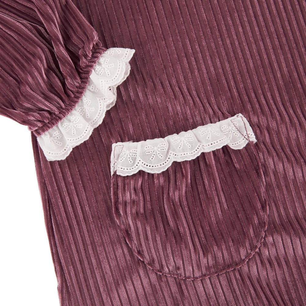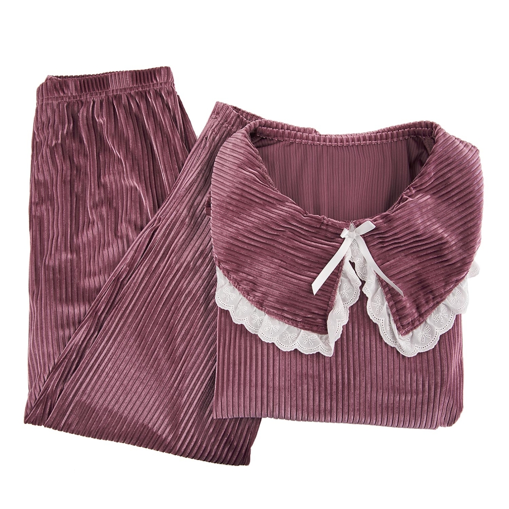 따뜻한 벨벳 스트라이프 자카드 소재의 여성용 상하 세트. 면 레이스 프릴 포인트와 둥근 플랫 칼라로 로맨틱 감성의 디자인 상품.