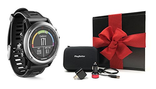 GIFT BOX BUNDLE INCLUDES: Garmin fenix 3 (Gray) Multi-Sport GPS Training Watch, Garmin USB Charging Cradle, PlayBetter Protective Hard Carrying Case, Wall & Car USB Charging Adapters | Beautifully packaged in Black Gift Box with Red Bow & Crinkle Paper!
