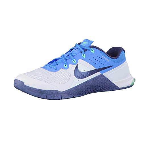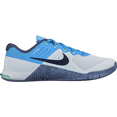 -. Binding : Apparel -. Brand : -. Color : Blue Tint/ Squadron Blue/ Blue Glow -. Department : womens -. Feature : Flywire cables contour around the midfoot and arch for a locked-down fit / Strategic perforations increase breathability in key areas of the midfoot / Rubber outsole wraps your midfoot for enhanced durability -. ProductGroup : Shoes -. ProductTypeName : SHOES -. Title : Women's Metcon 2 Training Shoes - Blue Tint/ Squadron Blue