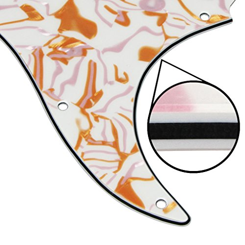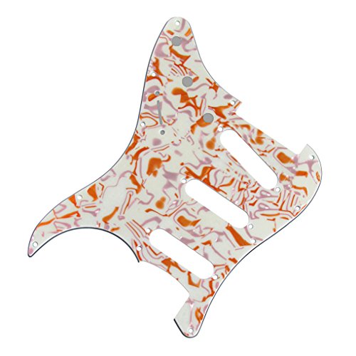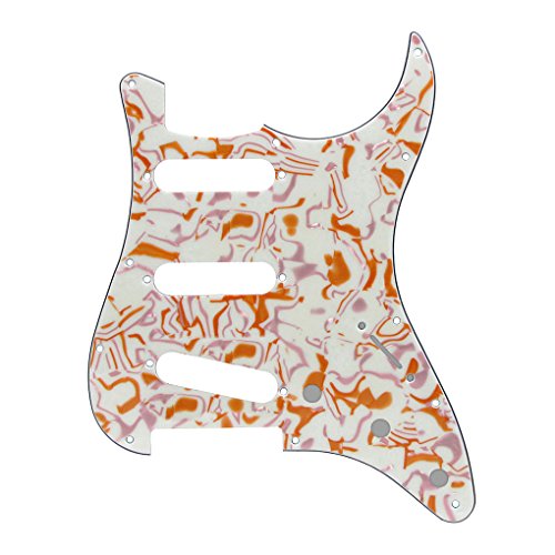 Product Description Feature: * For US Modern Fender Strat Stratocaster style guitar or similar.* With pure aluminum foil shield on the backside, not the common aluminum-foil paper on the market, better shielding property and anti-interference.* All materials are environmentally friendly, thermostability, no smell. Multi-layer plates are pressed under high temperature and pressures, to make them close integration between each layer, will not appear curly, deformation, or separation of different layers.* Excellent product process ensure the edge of the smooth and structured.Two layers of protective films on the front of pickguards, anti-scratch to protect the guitar.Specification:* Style: SSS(single/single/single coil) style pickguard; 11 screws holes in the side of pickguard.* Material: 3Ply Shell Plate and PVC* With pure aluminum foil shield.* Color: Golden/Purple Stripe Shell Color* With protective film on the surface, while using please split it off.* Note:Item's color might be different from the picture because of the aberration.Package Includes:1 x guitar pickguard 0