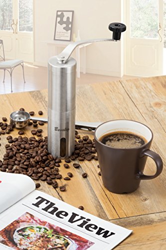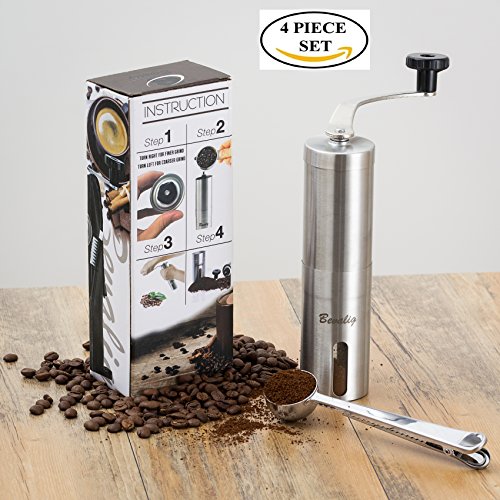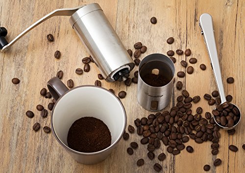 -. Feature : ☕ COFFEE GRINDER LIKE NO OTHER!: We get it , you love your coffee not just at home but also away from home. This coffee grinder is compact designed to fit into an AEROPRESS and it comes with a BONUS Travel POUCH, SPOON and cleaning BRUSH ! your best camping & travelling companion. / ☕ GRIND COFFEE WITH SPEED AND EASE: Designed with your comfort in mind, easy-turn hand-grind motion made possible by long steel handle that connects solidly to the grinder and the ability to hold the grinder steadily in one hand while turning the handle with the other . Our customers say "Easy like Sunday Morning" / ☕ PERFECT GIFT - UNCONDITIONAL LIFETIME GUARANTEE: This is an ideal GIFT item, elegantly packaged for Housewarming, Birthday, Bridal, Wedding Shower, Mothers' day, Hostess gifts. Consider getting two , one for you and one for your very best friend! If for any reason you are not 100% satisfied with your purchase, please contact customer service and you will receive a prompt and courteous refund--No questions asked. / ☕ CONSISTENT AND PRECISE GRIND: Equipped with fully adjustable easy to access conical ceramic burr to deliver precise and consistent grind, putting you in total control of your grind, be it espresso, pour over, french press/plunger, percolator or Turkish for that ultimate satisfying coffee experience / ☕ HIGH QUALITY MATERIAL : This grinder has ceramic burrs and food grade high quality stainless steel housing, which not only makes it easy to clean, but more resilient than glass versions, and produces less static than plastic versions. The conical ceramic burrs don't rust, are easy to clean and stay sharper for much longer than steel burrs.