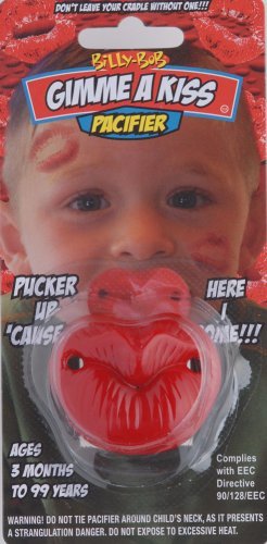 -. Binding : Baby Product -. Brand : Billy-Bob -. ClothingSize : One Size fits Most -. Color : Kiss Me -. Department : mens -. EAN : 8133860002890 -. Feature : Gimme a Kiss pacifier / safe and hillarious at the same Time / your Baby will Love them and so will you / sure to be a head turner that all the other parents will envy. -. IsAdultProduct : 0 -. Label : Billy Bob -. Manufacturer : Billy Bob -. Model : #82 -. MPN : #82 -. PackageQuantity : 1 -. PartNumber : #82 -. ProductGroup : Baby Product -. ProductTypeName : BABY_PRODUCT -. Publisher : Billy Bob -. Size : One Size fits Most -. Studio : Billy Bob -. Title : Billy Bob Pacifier - Kiss Me -. UPC : 658890500300