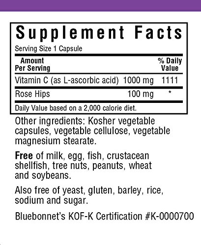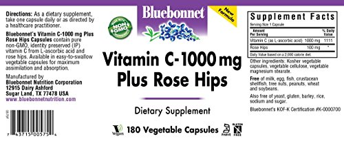 Bluebonnet's vitamin c plus rose hips provide vitamin c from pure l-ascorbic acid, rose hips and citrus bioflavonoids from fresh oranges, lemons, tangerines, grapefruit and limes, plus hesperidin. Available in easy-to-swallow vegetable capsule for maximum assimilation and absorption. Vitamin c helps tissue and bone grow and repair themselves. It can also help the body absorb the mineral iron. Vitamin c can also help protect against heart disease, prevent scurvy, and decrease total and ldl cholesterol and triglycerides. Rosehips are another source of vitamin c.Feature