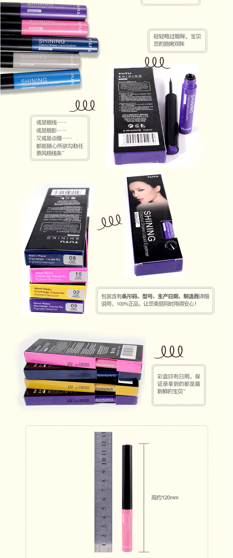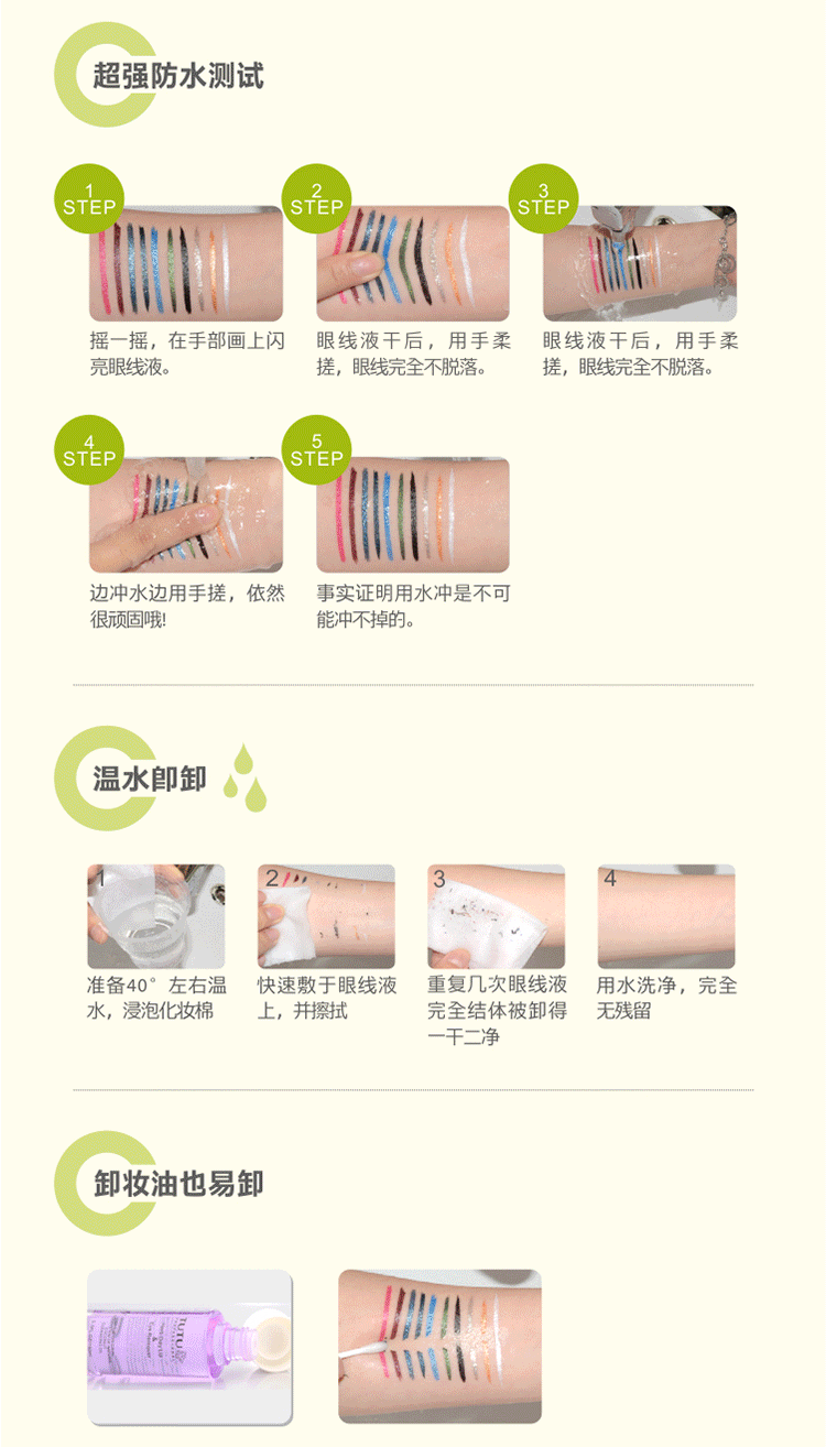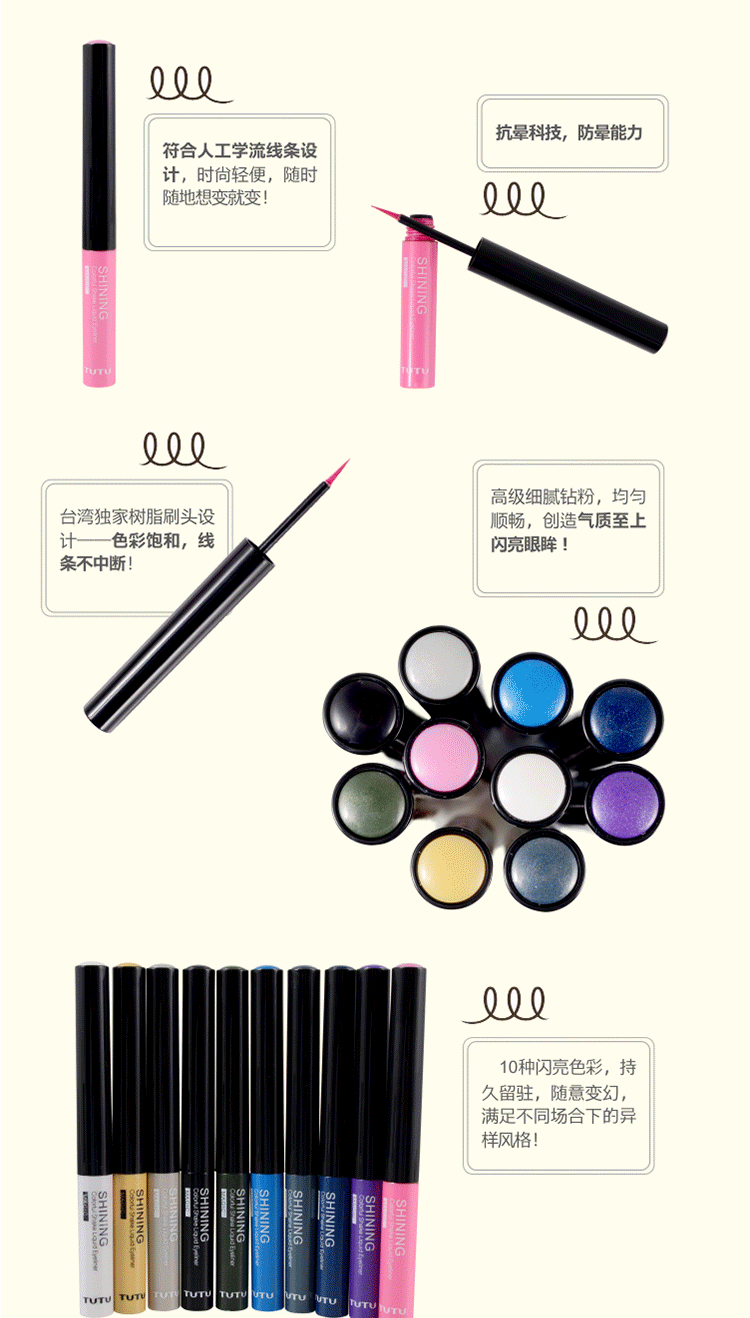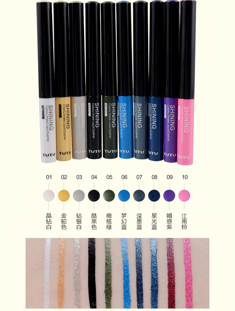 Name of shining colorful shake liquid eye liner 4ml flash piece of coloredliquid eye liner COSPLAY The origin of Chinese specification 4ml The texture of liquid and shelf-life of 3 years The main effect is not dizzy to dye Treasurer recommended 1 after you finish please give liquid of 20 seconds to dry, please move your eyes don't frequent blinking during this period! 2 in order to ensure the best liquid eyeliner anti corona effect, please confirm in painting Eyeliner before your eyelids are not oily and dry, not used eye gel or cream and other cosmetics containing greasy! Before theskin the best painting makeup smear ELF Eyeshadow primer. For the crowd All the beauty of the MM Product introduction ultra oil resistant formula. Warm water can discharge,including drilling powder to make eyes more silk feel special Japanese cotton head design. Can depict the uniform saturated eyeliner. Method of use Before using the 7 times to make pink rocking evenly mixed. Starting fromeye head. In the eyes of the face painted on a careful eye tail extending to2-3mm. Please use warm water to dab remover slowly wipe removable. | |