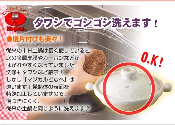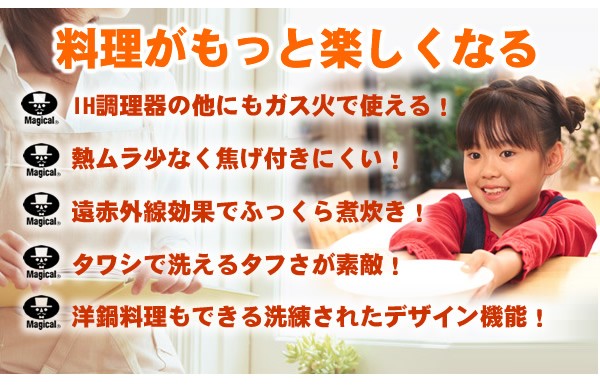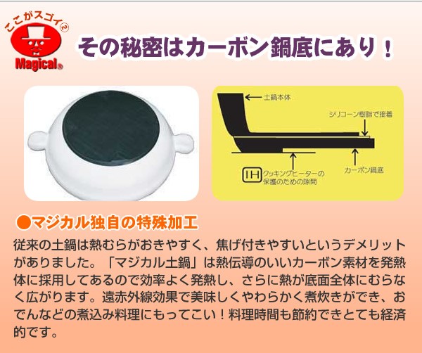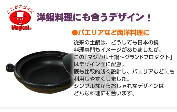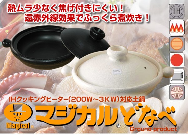 IH対応はもちろんガス直火や電子レンジ、ハロゲンヒーターにも使えちゃうまさにマジカルな土鍋。熱伝導がよく早く煮炊きでき、かつ遠赤外線効果で美味しく料理が作れます。デザイン面もおしゃれで洋鍋料理にも似合う。アレコレとにかく使い勝手抜群の逸品!