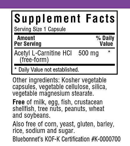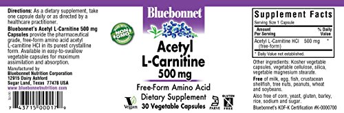 BlueBonnet's Acetyl L-Carnitine 500 mg vitamin capsules provide free-form acetyl L-carnitine HCI in easy-to-swallow vegetable capsules for maximum assimilation and absorption.Feature