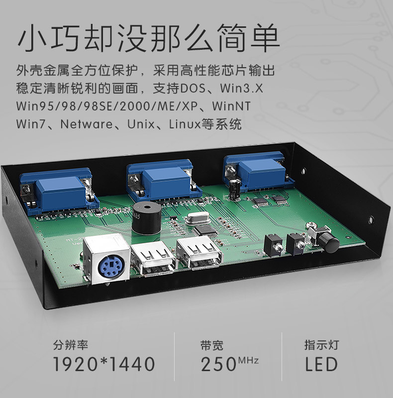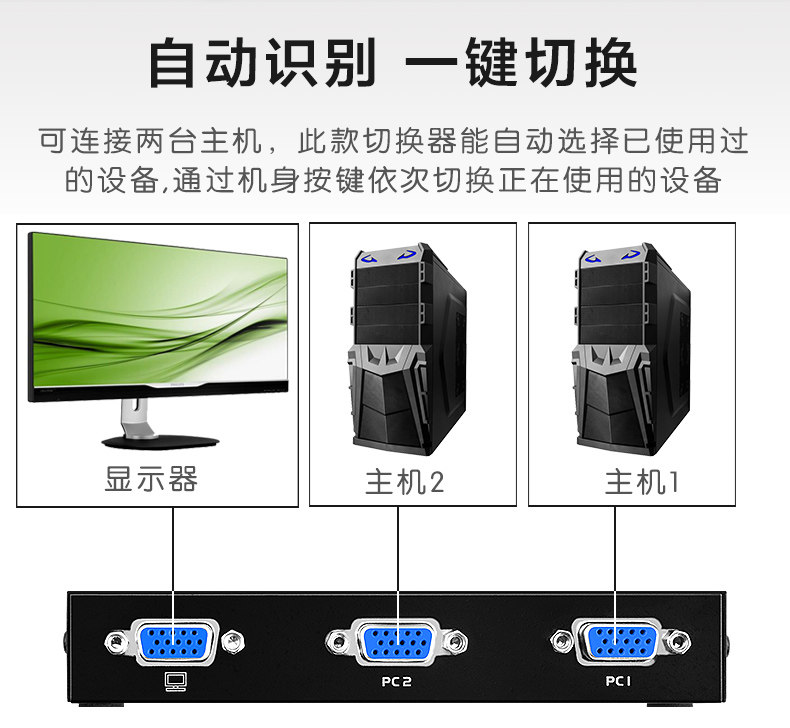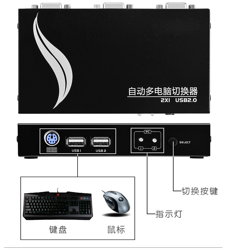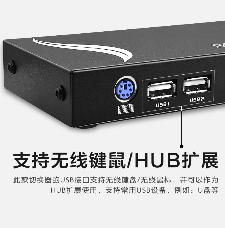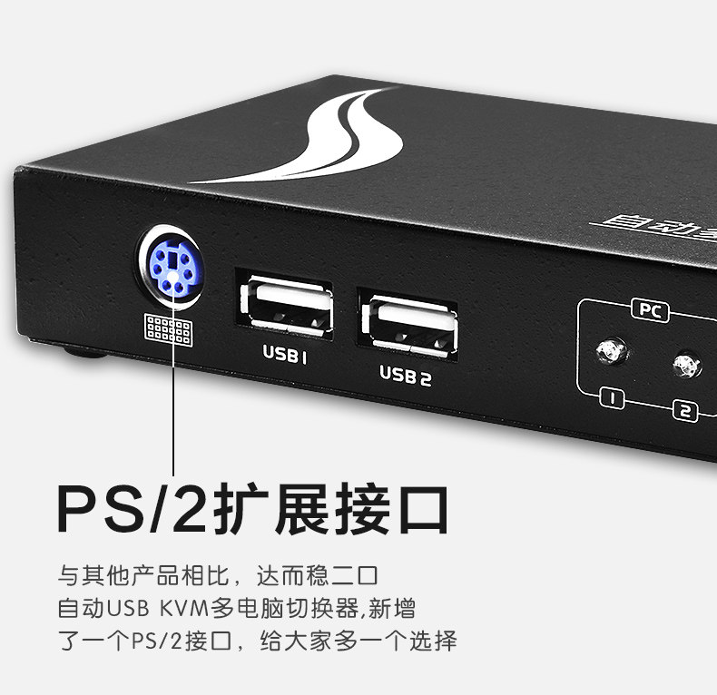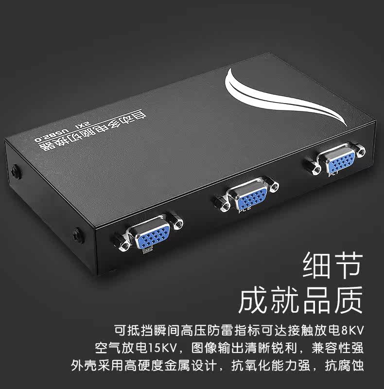 【产品优势】无须软件控制,可通过按键或热键切换(2秒钟内连续按下Scroll Lock键两次,随后会听到滴的一声,即可通过组合按键:Scroll Lock键 +1/2数字键切换)选择所要操控的电脑