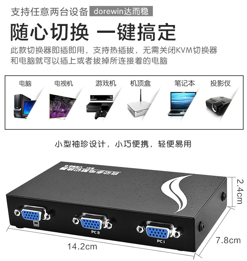 达而稳 VGA切换器二进一出KVM电脑视频2进1出显示器自动切屏器USB
